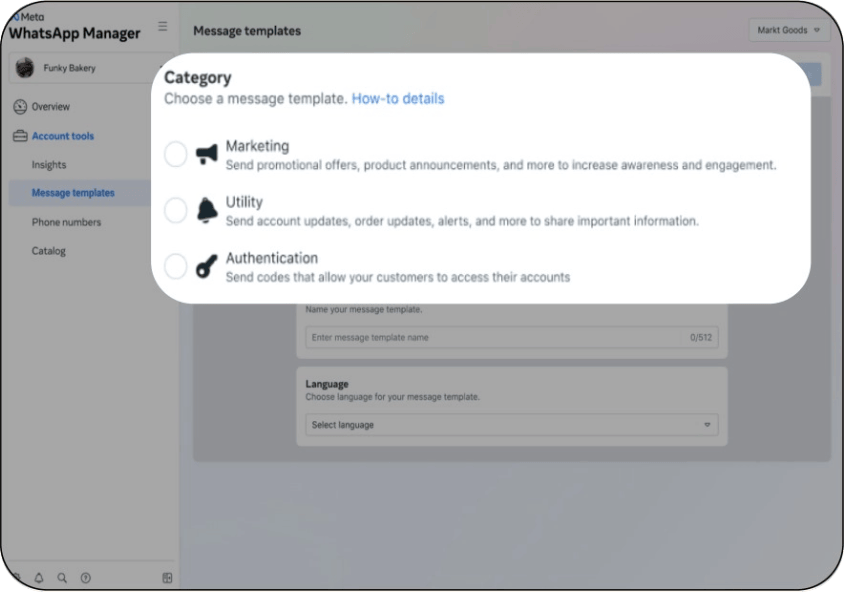 Choose template category upon template creation in either WhatsApp Business Manager or Business Management API.
