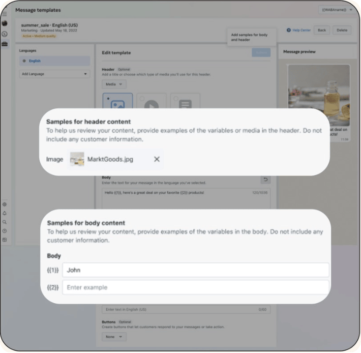 For any template that has variables, a sample with variables populated must be provided for the template category to be confirmed.