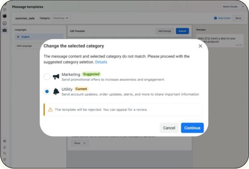 Starting April 1, 2023 template approval will require category validation using our new categories — utility, authentication and marketing.