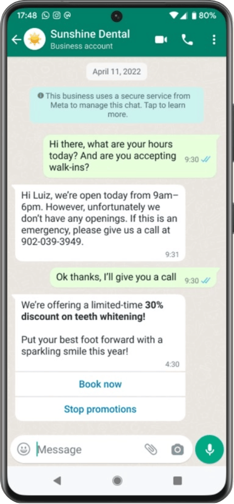 Business-initiated conversations to market a product or service to customer, such as relevant offers to customers who have opted in. Any business-initiated conversation that does not qualify as an authentication or utility conversation would also fall under this category.